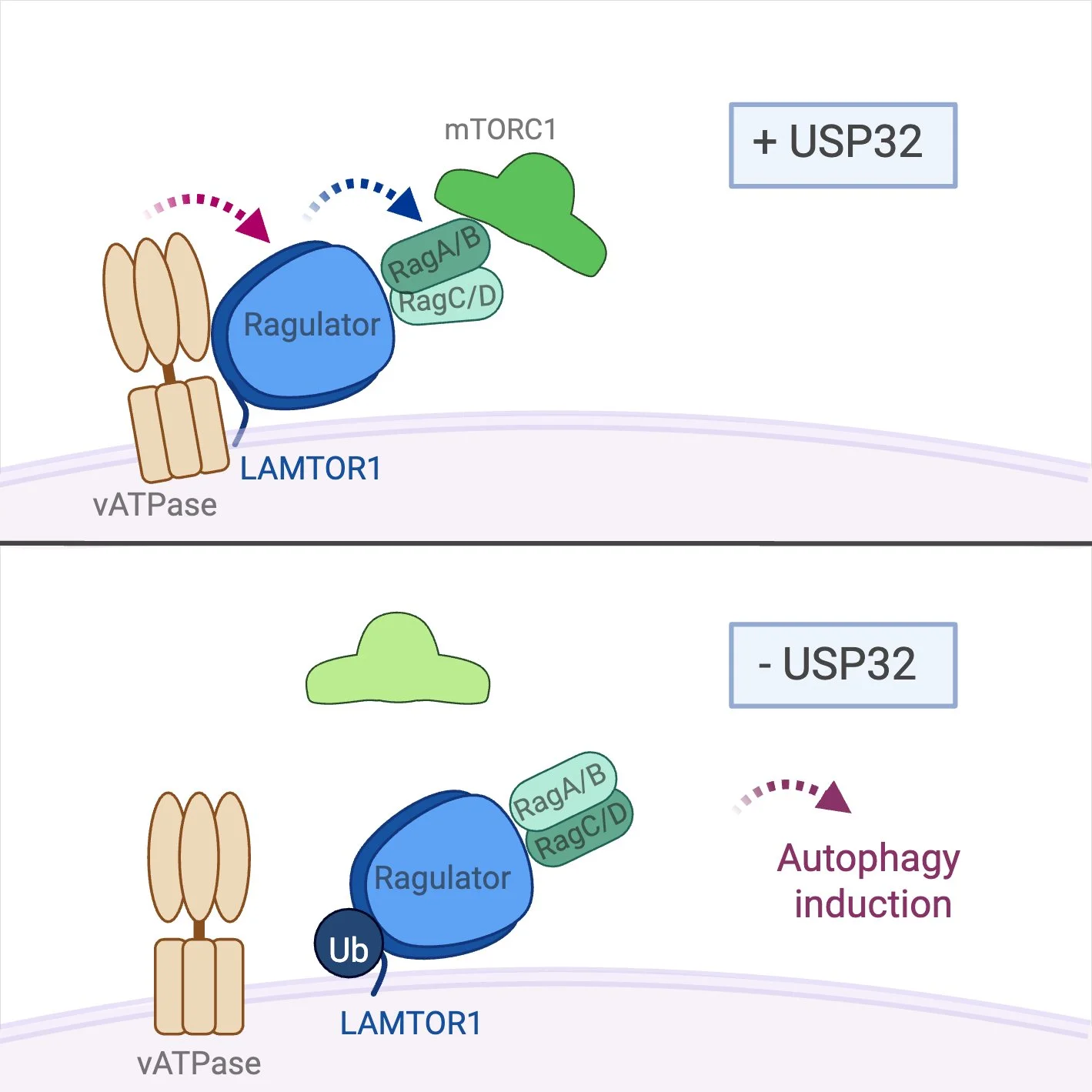 Lysosomes are not only degradative organelles but also central hubs for metabolic signaling. A key outcome of this signaling is activation of mTORC1, which regulates cell growth in response to nutrients. Amino acids activate mTORC1 by recruiting it to lysosomes via Rag GTPases and the Ragulator complex, a process dependent on the vacuolar H⁺‑ATPase (V‑ATPase) . At the lysosome, V‑ATPase physically interacts with Ragulator and undergoes conformational changes in response to amino acids, acting as both scaffold and sensor for amino acid availability. Cholesterol also feeds into this pathway through NPC1 and SLC38A9, establishing the V-ATPase as an integration point for amino acid and lipid signals. We previously identified a USP32-controlled ubiquitin signal at Ragulator subunit LAMTOR1 that limits V-ATPase binding, dampens mTORC1 activation even in the presence of amino acids, and promotes autophagy (Hertel et al., Cell Rep. 2022; funded by FOR 2625 “Mechanisms of Lysosomal Homeostasis”). Together, these findings highlight ubiquitylation as an important non-proteolytic regulator of mTORC1 signaling, and our ongoing work explores how ubiquitylation further controls V-ATPase assembly and function.